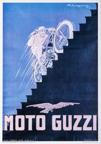 Η “Società Anonima Moto Guzzi” ιδρύθηκε στις 15 Μαρτίου 1921 με αντικείμενο την “κατασκευή και πώληση μοτοσυκλετών, καθώς και κάθε άλλη ενέργεια που σχετίζεται ή συνδέεται με την μεταλλουργία”. Αυτή ήταν η στιγμή που οι ιδρυτές Carlo Guzzi και Giorgio Parodi, επέλεξαν τον αετό με τα ανοικτά φτερά για λογότυπο της εταιρίας, στη μνήμη του συναδέλφου τους Giovanni Ravelli. Οι τρεις τους είχαν υπηρετήσει μαζί στο αεροπορικό σώμα του βασιλικού ναυτικού, όπου και συνέλαβαν την ιδέα για τη δημιουργία καινοτόμων μοτοσυκλετών, μόλις λήξει ο πόλεμος. Ο Ravelli σκοτώθηκε το 1919 κατά τη διάρκεια δοκιμαστικών πτήσεων και οι δύο φίλοι του, αποφάσισαν να τον τιμήσουν με το σύμβολο του αεροπορικού σώματος. Από τότε, ο αετός είναι το σύμβολο της Moto Guzzi και είναι ένα σήμα που απέκτησε παγκόσμια φήμη, σε πολύ σύντομο χρονικό διάστημα.