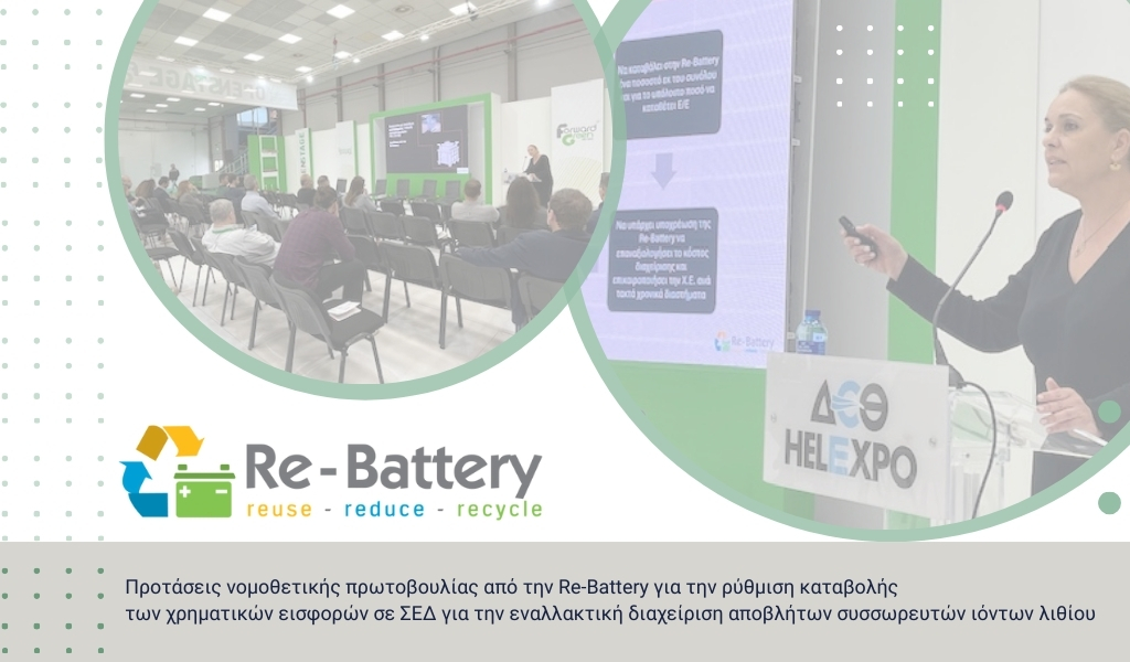 Στο πλαίσιο της έκθεσης Renewable EnergyTech και Forward Green EXPO στη ΔΕΘ, η Re-Battery παρουσίασε μια νέα πρόταση νομοθετικής ρύθμισης για τη χρηματοδότηση της εναλλακτικής διαχείρισης αποβλήτων συσσωρευτών ιόντων λιθίου (Li-Ion) αποθήκευσης ενέργειας. Η πρόταση, την οποία παρουσίασε η Σοφία Χούμα, Ειδική Σύμβουλος Στρατηγικής Ανάπτυξης, στοχεύει στη θεσμοθέτηση ενός μοντέλου που διασφαλίζει τη μακροπρόθεσμη