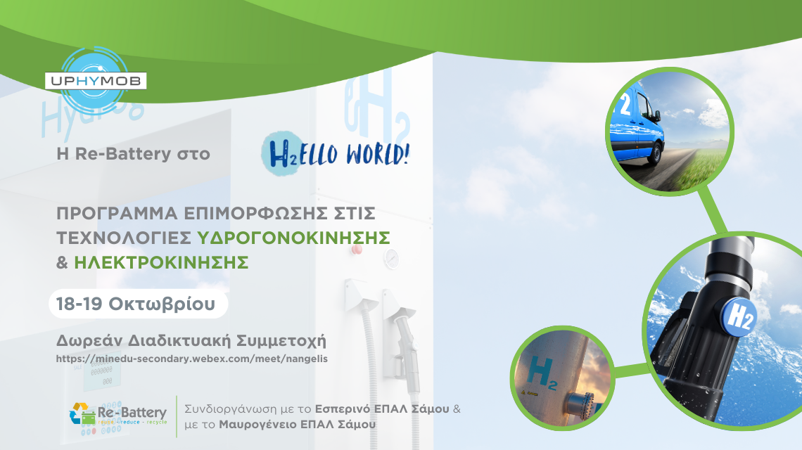 Η Re-Battery σε συνεργασία με το Εσπερινό ΕΠΑΛ Σάμου και με το Μαυρογένειο ΕΠΑΛ Σάμου πραγματοποιεί εκπαιδευτικές παρουσιάσεις το Σάββατο 19/10/2024, στα πλαίσια επιμορφωτικής διημερίδας / προγράμματος H2ELLO WORLD με θέμα την ηλεκτροκίνηση και την υδρογονοκίνηση. Η θεματολογία των παρουσιάσεων της Re-Battery είναι: • Πρωτόκολλο Διαχείρισης αποβλήτου συσσωρευτών υψηλής τάσης / Ηλεκτροκίνησης, εισήγηση από την Σ. Χούμα, Ειδικό Σύμβουλο Εναλλακτικής Διαχείρισης της Re-Battery. • Μπαταρίες Ιόντων Λιθίου (LIBs), πιθανοί
