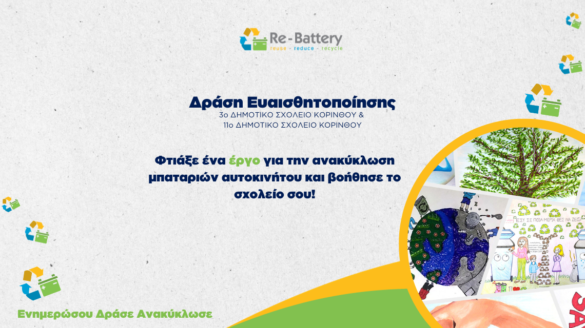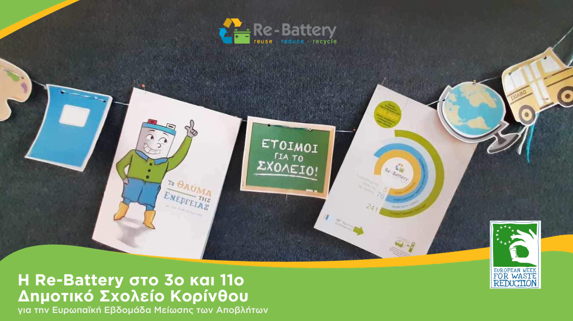 H Re-Battery ανταποκρινόμενη στο κάλεσμα του Ελληνικού Οργανισμού Ανακύκλωσης (ΕΟΑΝ), για την συμμετοχή στην Ευρωπαϊκή Εβδομάδα Μείωσης Αποβλήτων 18 – 26 Νοεμβρίου- #EWWR 2023, τη μεγαλύτερη Ευρωπαϊκή καμπάνια για την Ανακύκλωση, διοργάνωσε δράσεις ευαισθητοποίησης στους μαθητές Δημοτικών Σχολείων της Κορίνθου. Σε συνεργασία με τους διευθυντές και εκπαιδευτικούς του 3ου και το 11ου Δημοτικού Σχολείου Κορίνθου,