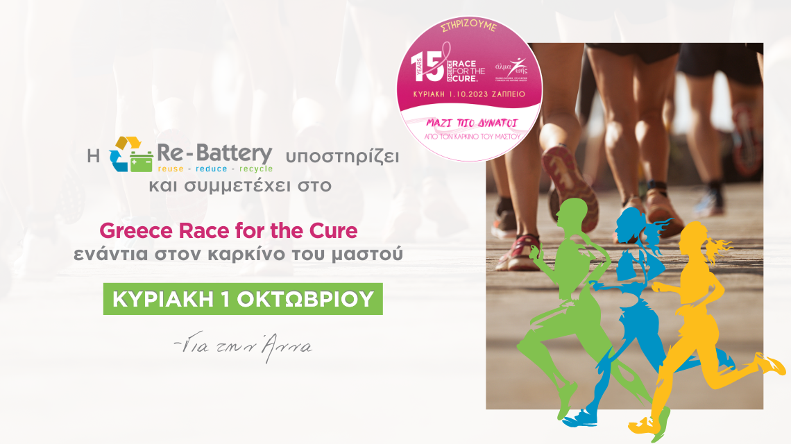 Με μεγάλη συγκίνηση και τιμή η Re-Battery υποστηρίζει και συμμετέχει στον συμβολικό αγώνα ενάντια στον καρκίνο του μαστού  Greece Race for the Cure 2023. Την Κυριακή 1 Οκτωβρίου τρέχουμε όλοι μαζί για την ελπίδα και τη θεραπεία από τον καρκίνο του μαστού. Μαζί, είμαστε πάντα πιο δυνατοί. Είμαστε όλοι εκεί για να τιμήσουμε όλες και