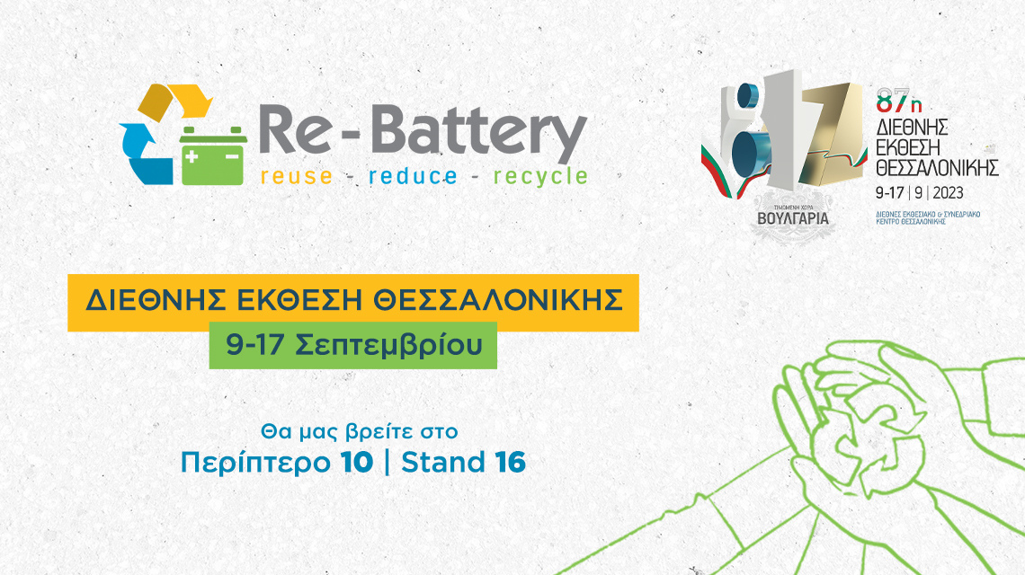 Η Re-Battery συμμετέχει για μια ακόμα χρονιά στην Διεθνή Έκθεση Θεσσαλονίκης. Μια έκθεση που θα παρουσιάσει τις νέες προτάσεις της αγοράς σε θέματα τεχνολογίας, καινοτομίας, προστασίας του περιβάλλοντος, ενέργειας, εκπαίδευσης, νεοφυών επιχειρήσεων και ηλεκτρονικής διακυβέρνησης αντανακλώντας ουσιαστικά, τη σύγχρονη κοινωνικό – οικονομική πραγματικότητα της χώρας. Ως Σύστημα Εναλλακτικής Διαχείρισης μπαταριών οχημάτων & βιομηχανίας, κύριος στόχος