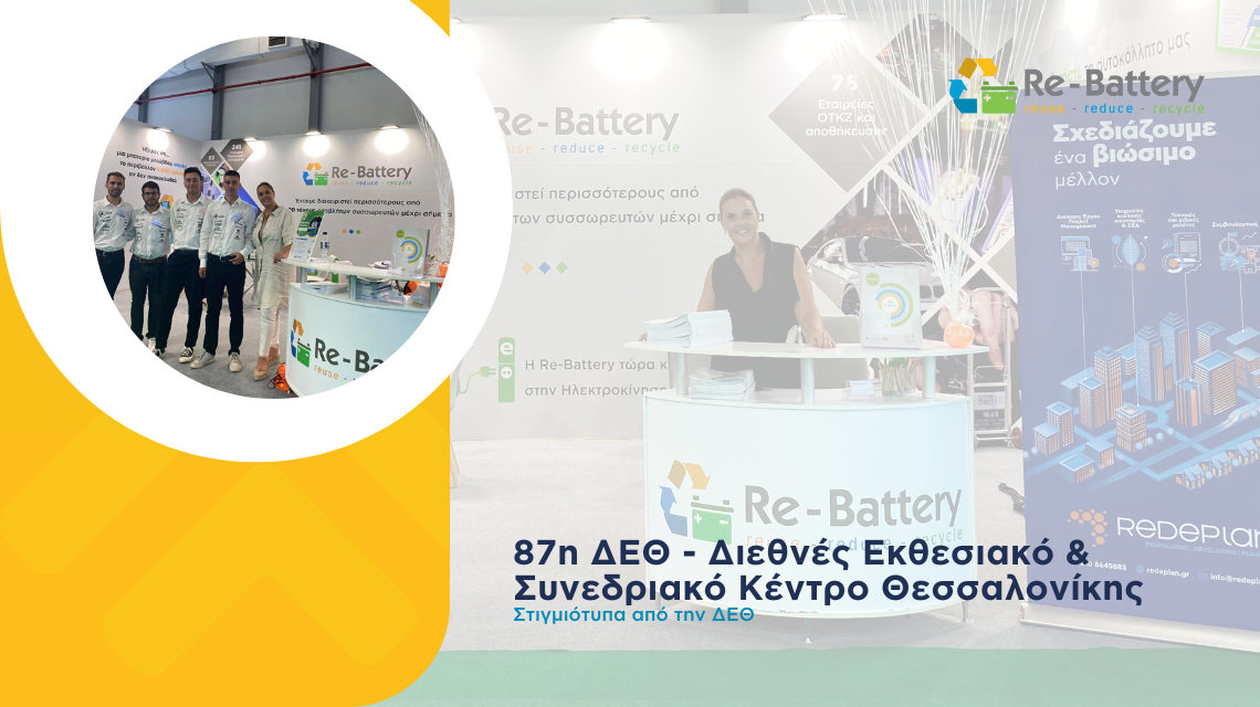 Η Re-Battery, ως Σύστημα για την Εναλλακτική Διαχείριση Συσσωρευτών οχημάτων & βιομηχανίας, συμμετείχε στην 87η Διεθνή Έκθεση Θεσσαλονίκης που πραγματοποιήθηκε από 9 έως 17 Σεπτεμβρίου. Η φετινή διοργάνωση εξαιτίας των έκτακτων συνθηκών που δεν επέτρεψαν την παρουσία του πολιτικού κόσμου, αφιερώθηκε στους 123.864 επαγγελματίες και πολίτες που την επισκέφτηκαν. Οι επισκέπτες του περιπτέρου μας ενημερώθηκαν