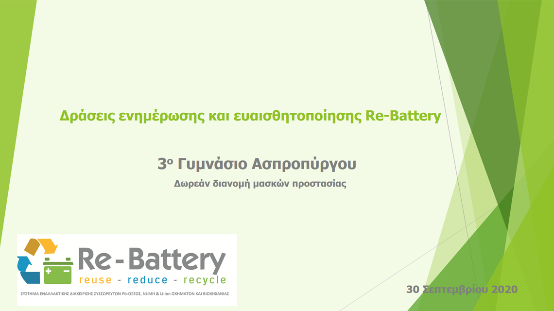 Το Σύστημα Εναλλακτικής Διαχείρισης Συσσωρευτών Re-Battery AE στο πλαίσιο των δράσεων ενημέρωσης και ευαισθητοποίησης που υλοποιεί και με αφορμή την ανησυχητική εξάπλωση του ιού COVID-19, διέθεσε στο 3Ο Γυμνάσιο Ασπροπύργου δωρεάν μάσκες για πρόληψη εξάπλωσης του ιού καθώς και έντυπο ενημερωτικό υλικό το οποίο αξιοποιείται και εμπλουτίζει την διδακτέα ύλη του Γυμνασίου στο μάθημα της Τεχνολογίας.
