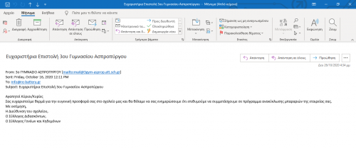 Η Διεύθυνση του Σχολείου, ο Σύλλογος Διδασκόντων και ο Σύλλογος Γονέων και Κηδεμόνων με κοινή τους επιστολή μας εξέφρασαν τις ευχαριστίες τους για την δωρεά και την δράση ενημέρωσης της Re-Battery.