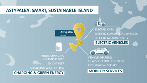 Το Volkswagen Group και η Ελληνική Δημοκρατία θα δημιουργήσουν ένα πρωτοποριακό σύστημα κινητικότητας στην Αστυπάλαια. Για το σκοπό αυτό, το τρέχον σύστημα μεταφορών στο νησί θα αντικατασταθεί από την χρήση ηλεκτρικών οχημάτων και την παραγωγή ανανεώσιμης ενέργειας. Μακροπρόθεσμα, η Αστυπάλαια θα καταστεί ένα νησί-πρότυπο για την κλιματικά ουδέτερη κινητικότητα. Ένα σχετικό Μνημόνιο Συνεργασίας (Memorandum of Understanding) υπεγράφη σήμερα στην Αθήνα και στο Βόλφσμπουργκ, από τον κ. Κωνσταντίνο Φραγκογιάννη, Αναπληρωτή Υπουργό Εξωτερικών για την Οικονομική Διπλωματία και την Εξωστρέφεια και τον Dr. Herbert Diess, Διευθύνοντα Σύμβουλο του Volkswagen Group, αντίστοιχα. Οι νέες υπηρεσίες κινητικότητας, όπως ο διαμοιρασμός ή η κοινή χρήση οχημάτων θα βοηθήσουν στη μείωση και τη βελτιστοποίηση της κυκλοφορίας. Η ενέργεια θα παράγεται κυρίως από τοπικές πηγές πράσινης ενέργειας, όπως η ηλιακή και η αιολική. Το έργο αρχικά θα διαρκέσει έξι χρόνια.