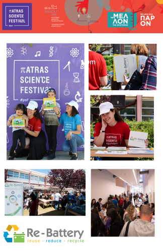 Η Re-Battery συμμετείχε στο Patras Science Festival 2019 όπου διοργανώθηκε από τον εκπαιδευτικό οργανισμό “Επιστήμη Επικοινωνία – SciCo” και το Ελληνικό Ανοικτό Πανεπιστήμιο υπό την αιγίδα του Ελληνικού Ανοικτού Πανεπιστημίου και της Γενικής Γραμματείας Έρευνας και Τεχνολογίας με την υποστήριξη της Περιφερειακής Διεύθυνσης Εκπαίδευσης Δυτ. Ελλάδας και του Αρχαιολογικού Μουσείου Πατρών σε συνεργασία με πλήθος ακαδημαϊκών, ερευνητικών φορέων και εκπαιδευτικών οργανισμών.