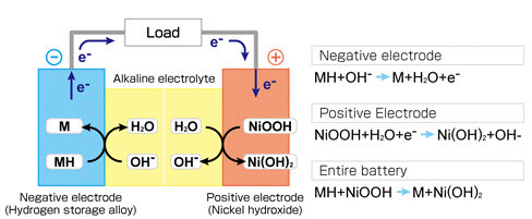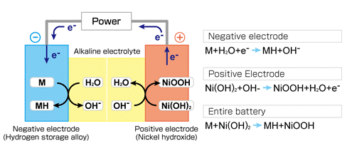 - Αρνητικό ηλεκτρόδιο -άνοδος αποτελείται από ένα κράμα που έχει την ικανότητα να απορροφά το υδρογόνο. Το μέταλλο (Μ) στο αρνητικό ηλεκτρόδιο είναι μια διαμεταλλική ένωση που περιέχει νικέλιο.