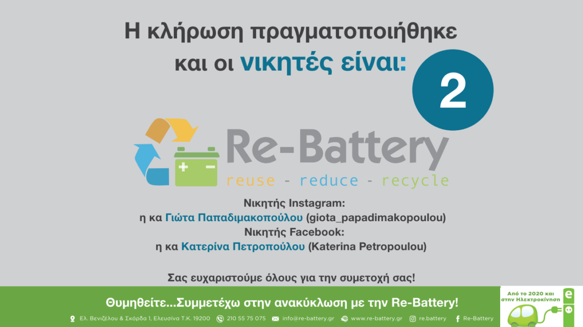 Παρακαλούμε οι νικητές να επικοινωνήσουν έως 31/12/2021 ώρα 12:00 το μεσημέρι, με τη Re-Battery στο τηλέφωνο 210-5575075 ή στο email info@re-battery.gr, για τη γνωστοποίηση των στοιχείων τους, αναφορικά με την αποστολή του δώρου τους.