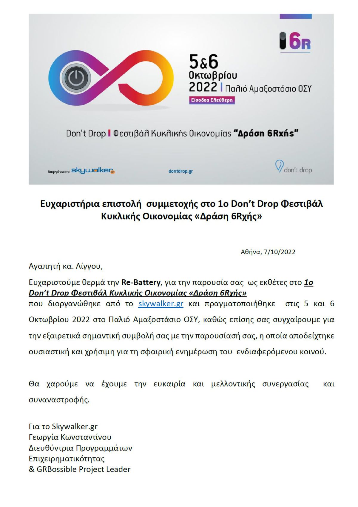 Το 1ο Don’t Drop Φεστιβάλ Κυκλικής Οικονομίας «Δράση 6Rχής» πραγματοποιήθηκε στις 05 & 06 Οκτωβρίου, υπό την αιγίδα του Υπουργείου Περιβάλλοντος και Ενέργειας, σε ειδικά διαμορφωμένο χώρο στο Παλιό Αμαξοστάσιο του ΟΣΥ, όπου σκοπός του διήμερου φεστιβάλ ήταν η ενημέρωση και η ευαισθητοποίηση όλων σχετικά με την έννοια της κυκλικής οικονομίας.