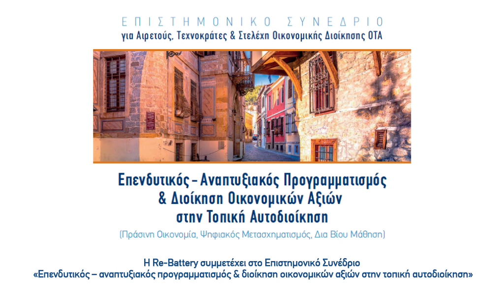 Η Re-Battery υποστηρίζει ως Μεγάλος Χορηγός το 3ήμερο Επιστημονικό Συνέδριο για Αιρετούς, Τεχνοκράτες & Στελέχη Οικονομικής Διοίκησης ΟΤΑ με θέμα: «Επενδυτικός – αναπτυξιακός προγραμματισμός & διοίκηση οικονομικών αξιών στην τοπική αυτοδιοίκηση» που διοργανώνει η Πανελλήνια Ένωση Γενικών Γραμματέων Τοπικής Αυτοδιοίκησης «Κλεισθένης», ο Δήμος Ξάνθης και ο Φορέας Επιμόρφωσης Στελεχών της Τοπικής Αυτοδιοίκησης International Forum Training & Consulting. Το Συνέδριο θα λάβει χώρα στην Ξάνθη, στις 12 με 15 Μαΐου.