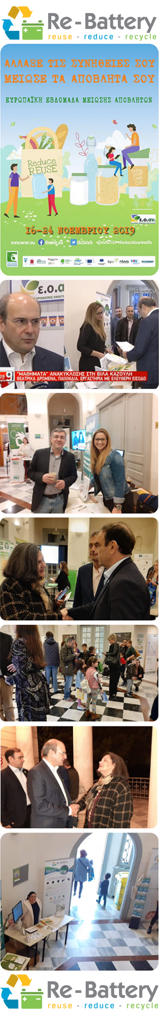 Tο Πανελλαδικό Σύστημα Εναλλακτικής Διαχείρισης Αποβλήτων Συσσωρευτών «Re–Battery A.E» έδωσε το δικό του ξεχωριστό παρόν στη διήμερη γιορτή ευαισθητοποίησης του κοινού στο θέμα της ανακύκλωσης, που διοργάνωσε ο Ελληνικός Οργανισμός Ανακύκλωσης (Ε.Ο.ΑΝ.) στην Κηφισιά (Βίλα Καζούλη), στο πλαίσιο της ευρωπαϊκής εβδομάδας μείωσης αποβλήτων.